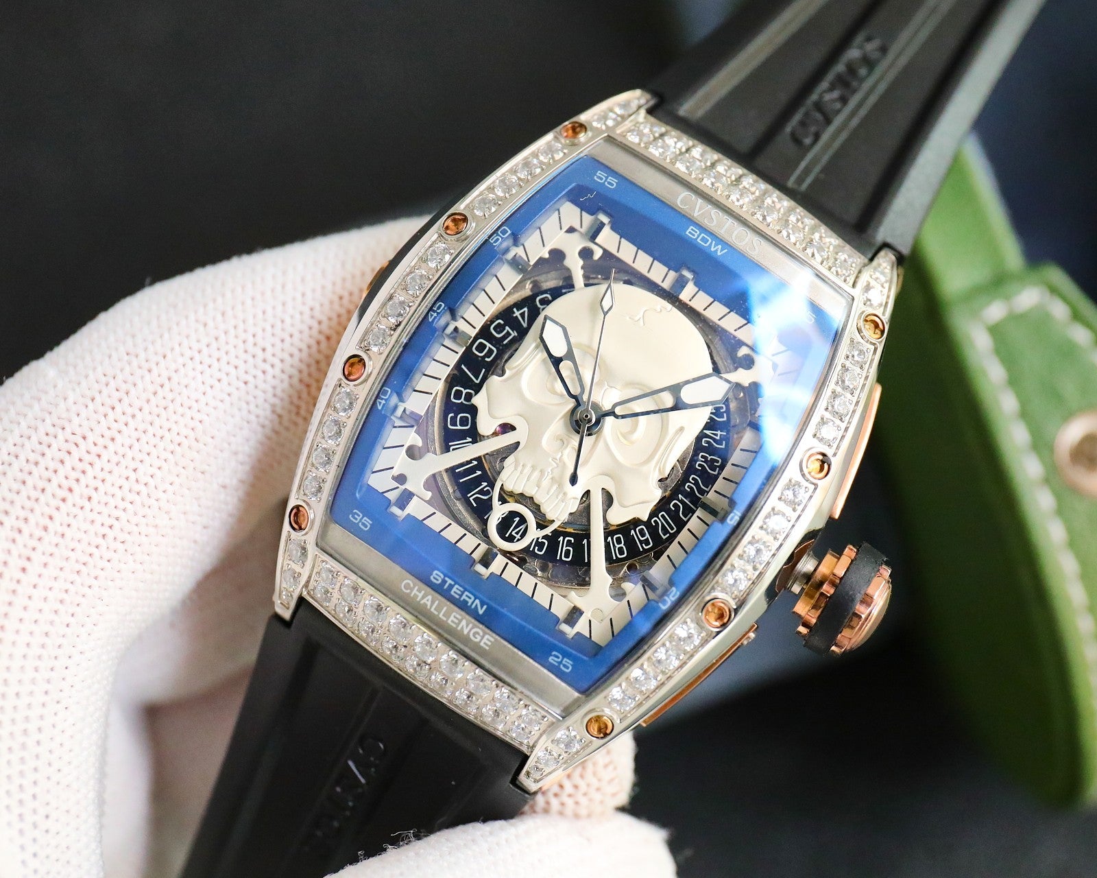 When you receive your watch,first please wind it fully (gently pull the crown out and turn it clockwise 40 times), calibrate the time and then wear it for the whole day, the tourbillon inside the automatic watch will keep working due to the movement of the hand, also it will stop working when it stands still for 24 hours . Don't let it fall from a height, keep it away from magnets, try not to dive or swim with it on.And please note that all automatic watches do not adjust the calendar, month and other functions when the hours hand is between 8-2 o'clock to avoid possible damage to the movement, and you can adjust the calendar and other functions when the hours hand is between 3-7 o'clock.